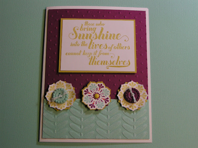 This Hummingbird from Bloomin' Marvelous is looking for some nectar in these flowers. The Primrose Petals mat is punched with the 2 1/2 circle punch, sentiment stamped and then embossed with the Vine Street embossing folder. I sanded the leaves for that vintage look.