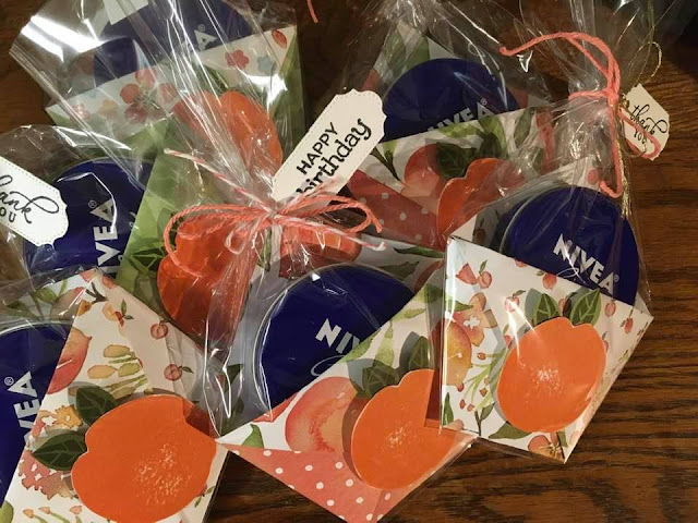 Here are a few more Peach Patterns used in a Diaper Fold to hold a tin of Nivea Hand Cream. Great little gifts for all occasions! I will have these at the Market on Saturday. 8am-1pm. Pick up catalogs this Saturday and see all the NEW Holiday goodies!