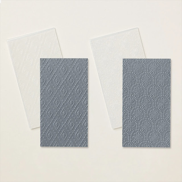 Fun Patterns are 2 NEW Embossing folders that fit in the Mini Embossing Machine. The folders are 3 inches wide and perfect for a Embossed Backgound on this Calypso Coral card base. I love how this Daisy pattern pops on White cardstock. I had the Memory & More cards nearby and this Floral pattern card was a Match! The Long sentiment and a Daisy Sticker pull this look together!