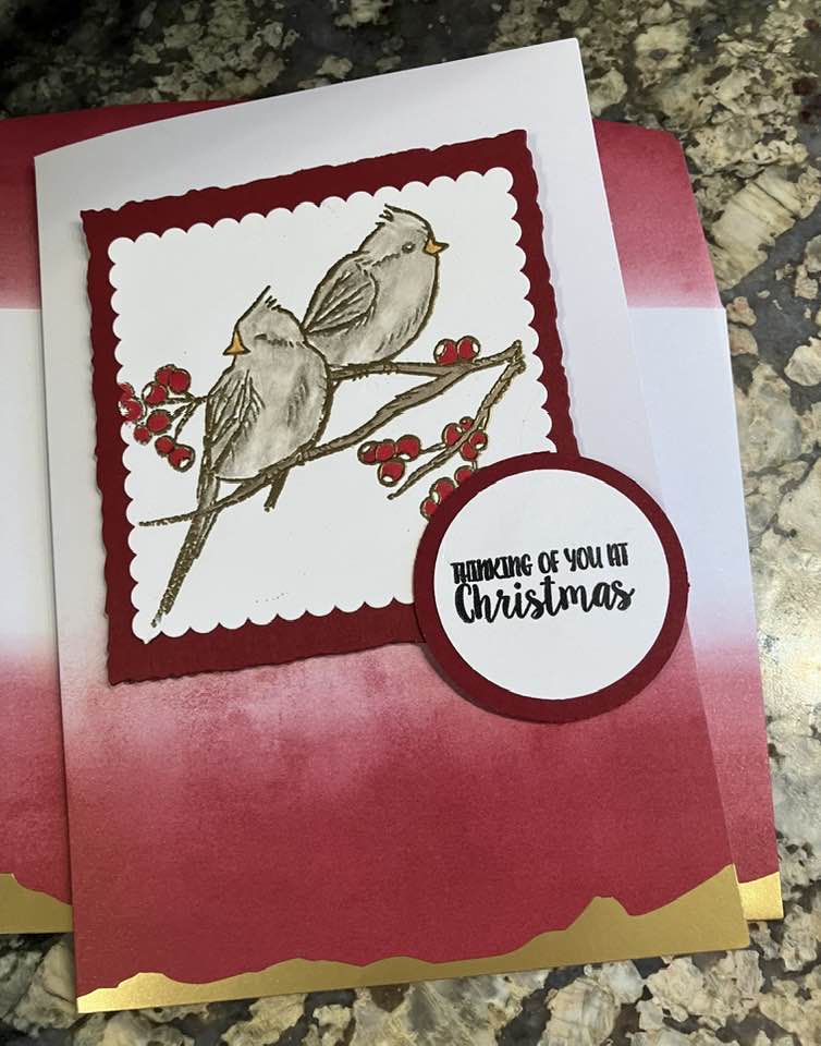I worked on some Christmas cards today!! WOO HOO!! I showed you a Blue Shepherd card a few days ago and today I used the Cherry Cobbler card bases and grabbed the Gold Embossing powder. My embossing powder is OLD and probably should be replaced. But I worked thru the struggle and managed NOT to burn the paper! The Birds from Winterly Tree Tops Bundle are perfect for embossing!