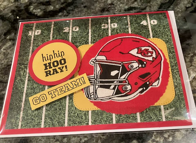 I have been making KC Chiefs cards this week! Look for them on the Card Rack this Saturday Jan. 4th. You can see some of the Fabric I purchased and more of the Yard line paper. I used Tear and Tape to adhere the Fabric words and the ribbon. Added a Sentiment from my Retired Sports stamp set.
